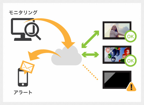 万が一、プレーヤーのハードウェア故障等により放映異常が発生した場合でも、異常を検知して管理者へ自動的にメール通知します。プレーヤーのステータスは、WebUI上からいつでも確認できます。