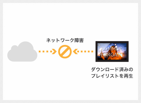 一時的なネットワーク障害で、サーバへの接続が途絶えても、DISE CLOUDのプレーヤーアプリケーションなら、コンテンツの放映に影響はありません。事前にダウンロードしたコンテンツをスケジュール通りに、安定した再生を続けます。