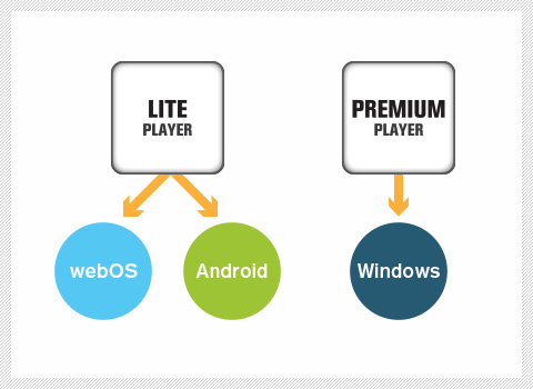DISE CLOUDのプレーヤーアプリケーションは、マルチプラットフォーム対応のシンプルで簡単な「LITEプレーヤー」と、Windows OS専用の多機能・高性能・クオリティ重視の「PREMIUMプレーヤー」をご用意。 用途、設置環境、予算に合わせてお選びいただけます。