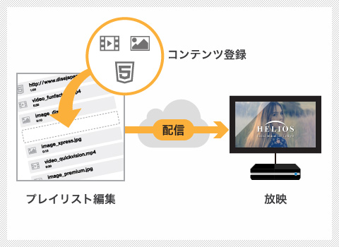 DISE CLOUDの番組編成は、使いやすいプレイリスト形式。プレイリストにコンテンツを登録して、放映順序を指定するだけで簡単に番組を編成できます。初めてデジタルサイネージを運用する方や、PCの操作に不慣れな方でも安心してご使用いただけます。