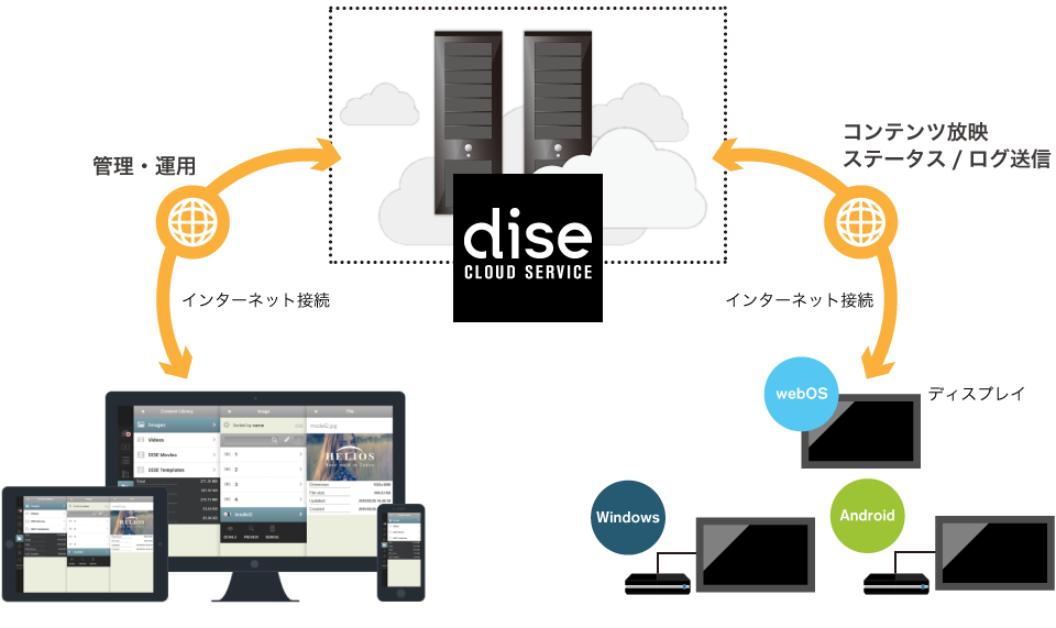 DISE CLOUDの管理画面は、マルチデバイス対応の使いやすいWebベースのコンテンツマネジメントシステムです。インターネットに接続可能なPC、タブレットやスマートフォン等の様々なデバイスから、画像・動画などのコンテンツをクラウド上へ登録し、リモートのプレーヤーへ簡単に配信することができます。